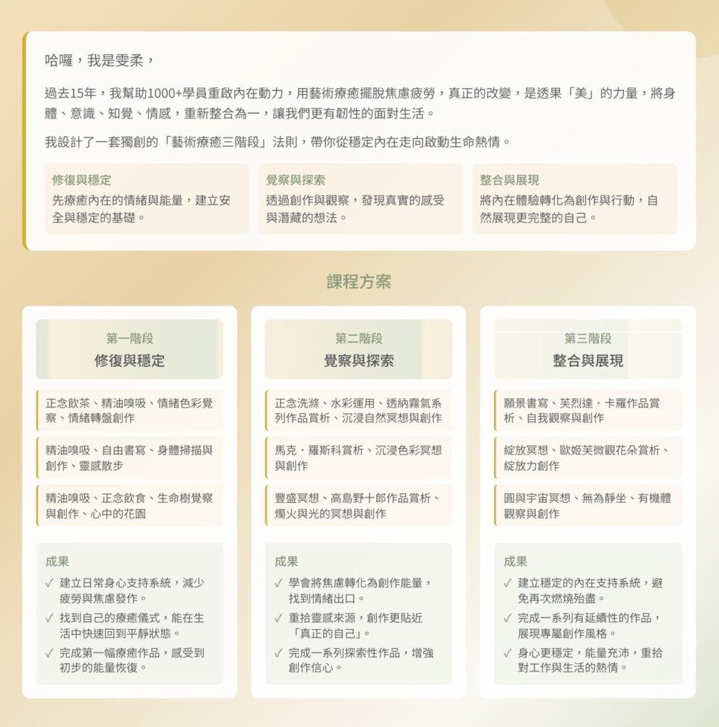 我的課程整合了五感覺察,我具有哲學藝術的細膩視角,是少數能陪伴你深度照見內在的療癒導師。